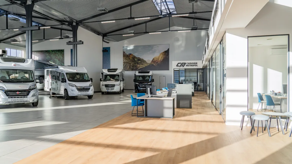 In Caravan Metropol’s showroom and shop, customers can see the latest trends in the world of caravans and buy different camping equipment. The place, with an industrial tinge, was designed by Konceptual and furnished by PROFIL NÁBYTEK, a.s.. One of the goals of the project was to match the colours with the structural elements of the building, putting metal details in the furniture and refine the place with natural wood.