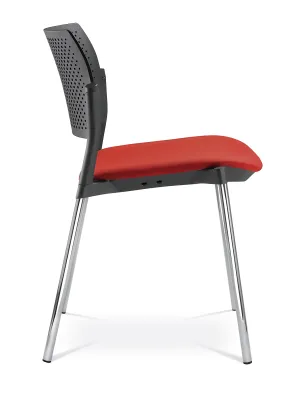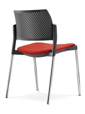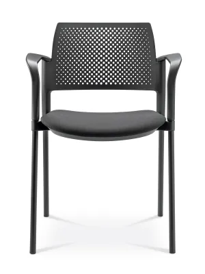 Chaise de conférence empilable avec siège rembourré et accoudoirs en nylon. Son dossier perforé assure confort et style dans vos espaces de travail.